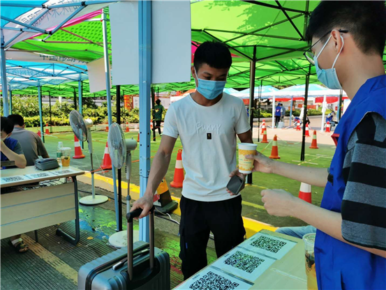 报到后,一杯清凉的菊花茶为同学们扫除了一路旅途奔波的闷热和劳累。为防暑降温,学校在校门口准备了雾化风扇、大冰块、水帘喷雾、冰镇矿泉水和菊花茶等,耐心的指引、关切的询问、充足的防护物资,无一不让返校的同学们感受到如家般的无微不至。