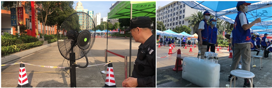 雾化风扇、大冰块、水帘喷雾和菊花茶等防暑降温设施齐上阵
